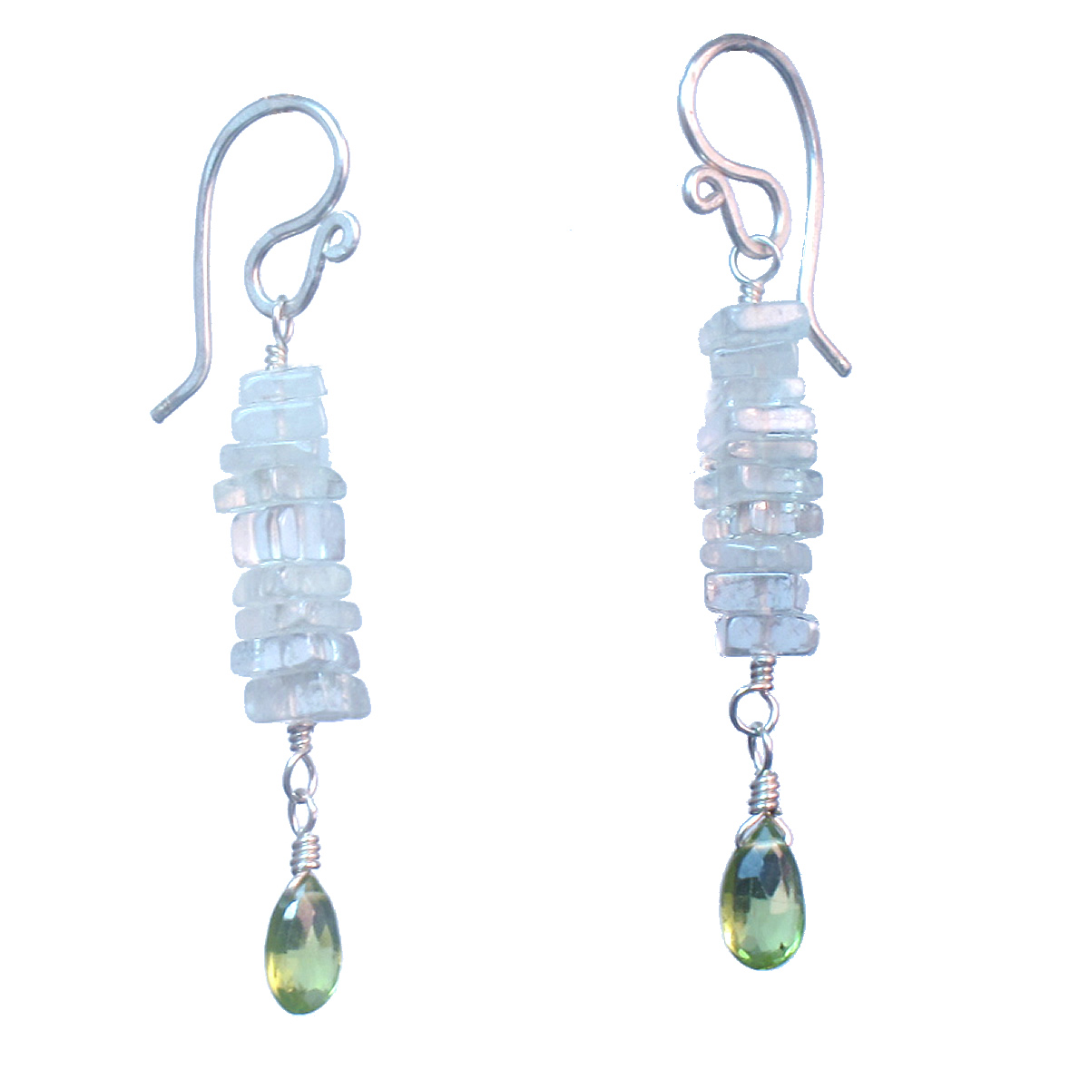 Aquamarine squares linked with peridot, about 1-3/4" long.
