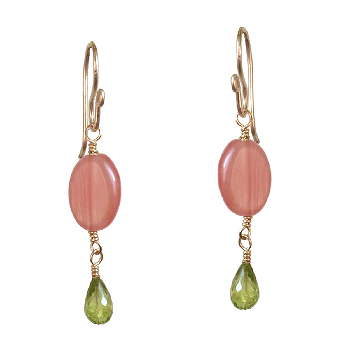 Rhodocrosite with peridot, about 1-1/4" long. Available in either 14K gold-filled, rose gold-filled, or sterling silver.