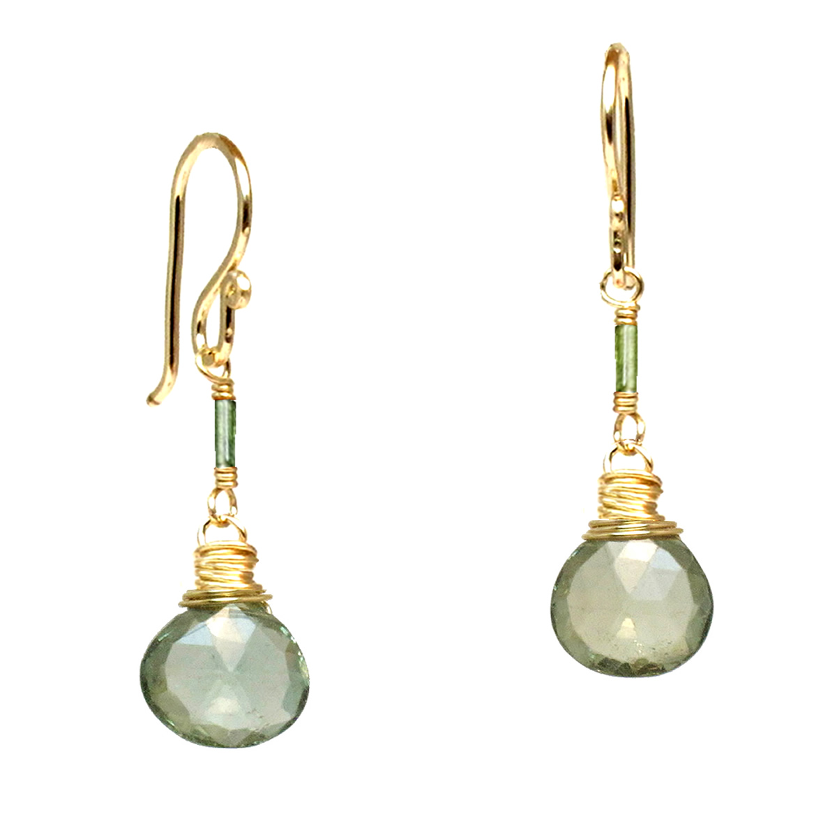 Green tourmaline stick with green amethyst, from about 1-1/4" long.