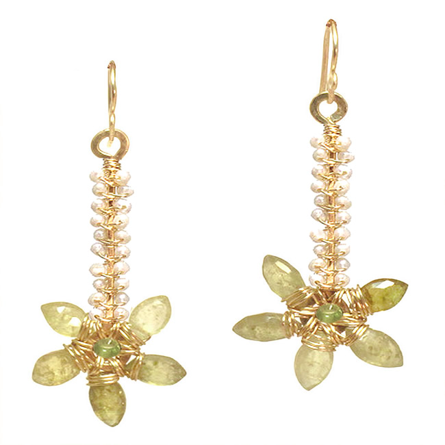 Hammered sticks wrapped with tiny ivory pearls and green garnet, abut 1-3/4" long