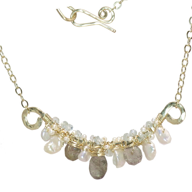 Mixed pearls, labradorite, and aquamarinewrapped on hammered frame, about 18". Contact us for different lengths.