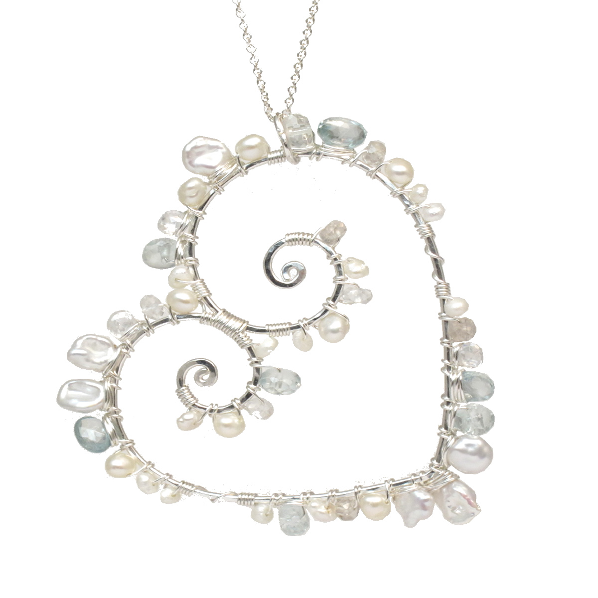 Hammered heart wrapped with pearls, aquamarine, and crystal quartz, on 18" length chain (heart is about 2" long). Contact us for different lengths.