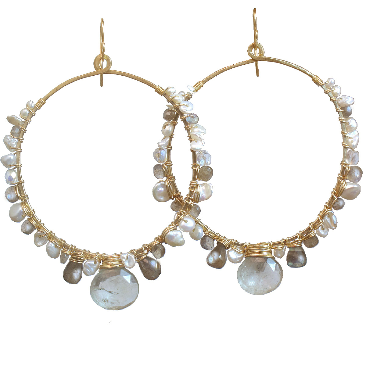Large hoops wrapped with labradorite, keshi pearls, and green amethyst, about 2" long.