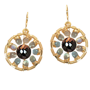Hammered circles with labradorite and black spinel wrapped around inside, about 1-1/4" long.