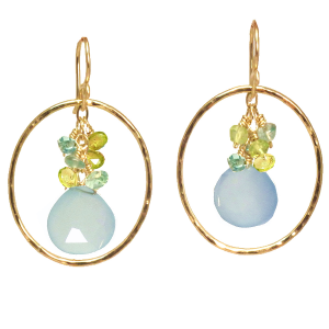Hammered circles with peridot, apatite, and sea blue chalcedony, about 1-1/2" long.