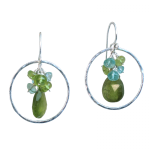 Hammered circles with dangling apatite, peridot, and idocrase, about 1-1/2" long.