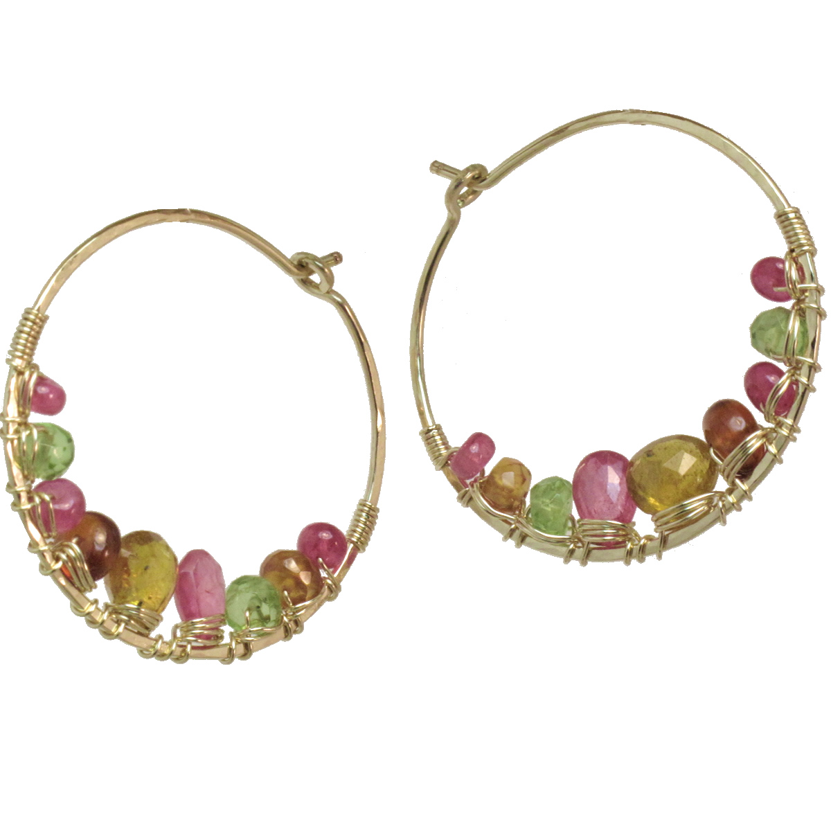 Hammered hoops with citrine, mandarin garnet, peridot, and ruby wrapped around inside, about 1-1/4" long.