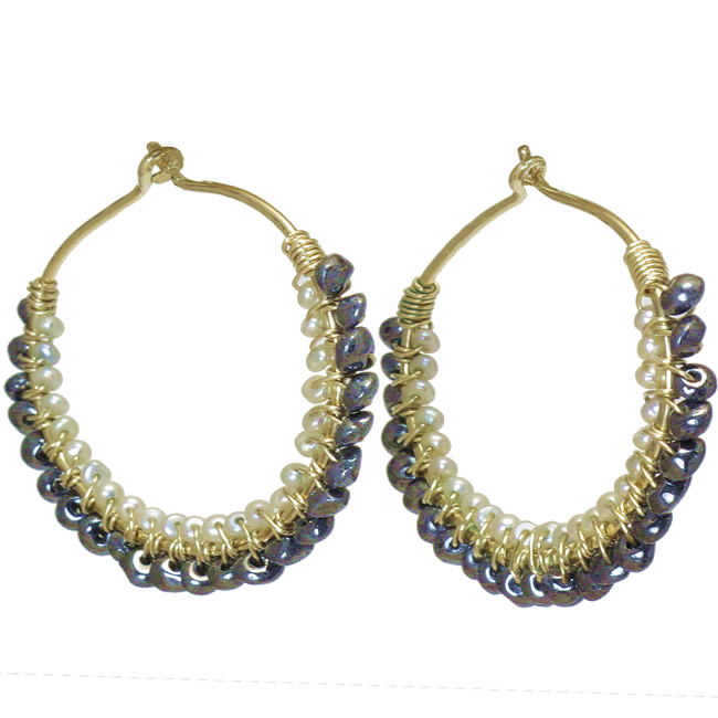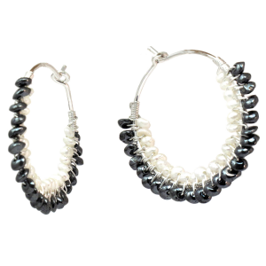 Hoops wrapped with black spinel and pearls, about 1-3/4" long.