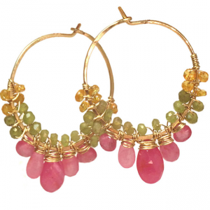 Hoops wrapped with orange sapphire, peridot, and pink sapphire, about 1-3/4" long.