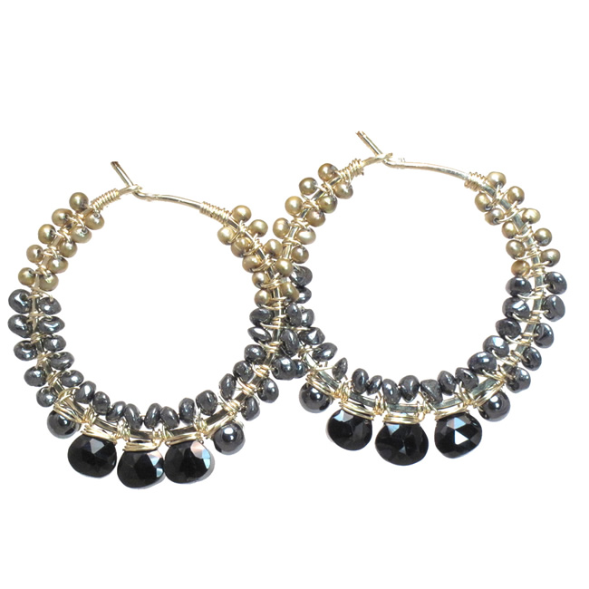 Hoops wrapped with black spinel, pyrite, and bronze pearls, about 1-1/2" long.