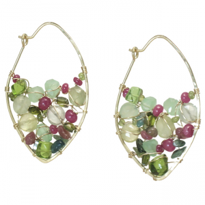 Marquis shaped hoops wrapped with prehnite, pink and green tourmaline, peridot, and green garent, about 1-3/4" long.