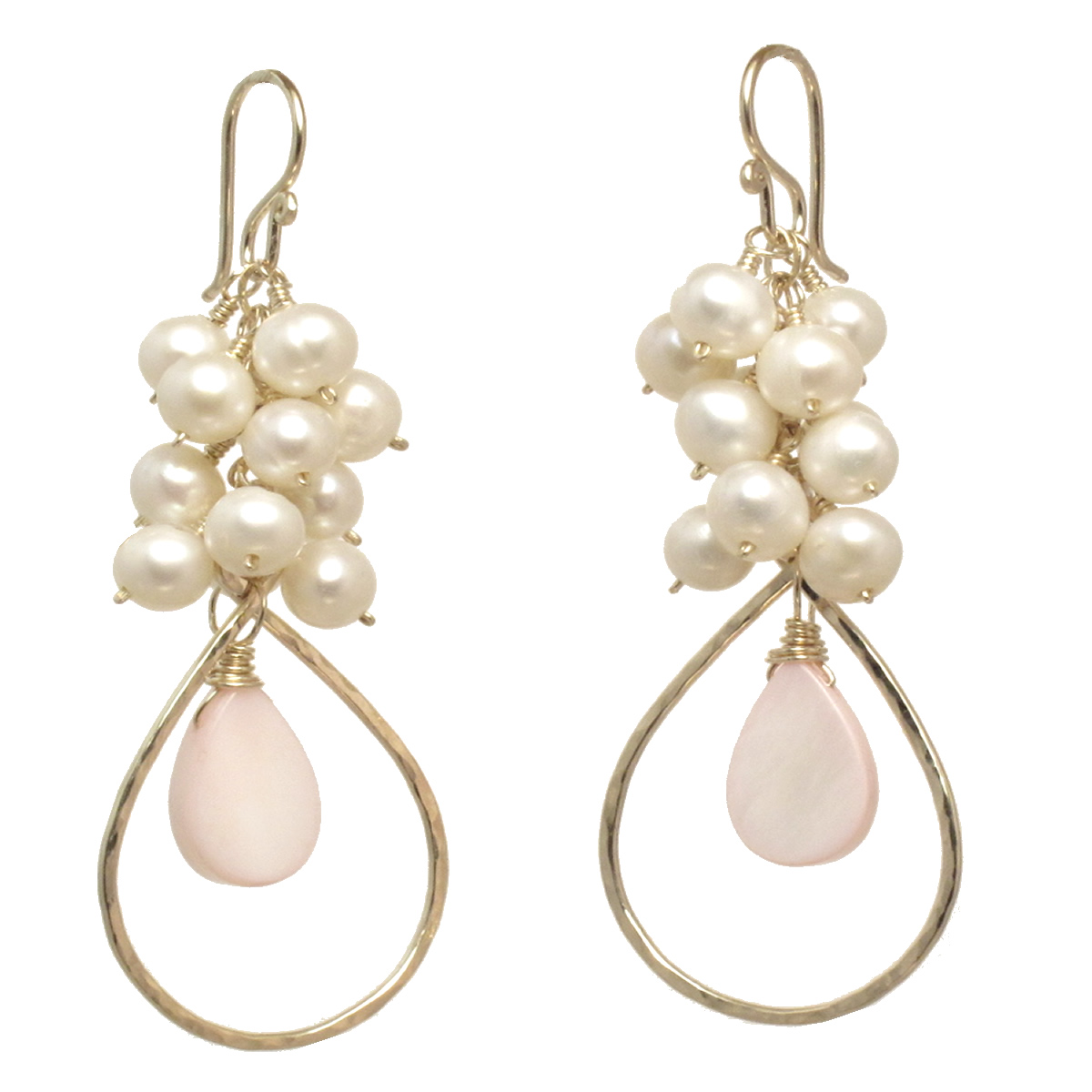 Ivory pearls with pink mother of pearl insidea hammered drop, about 1-1/4" long.