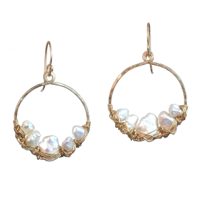 Ivory pearls wrapped inside a hammered circle, about 1-1/4" long.