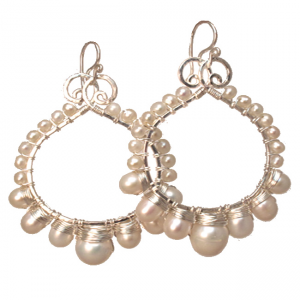 Hammered drop shapes wrapped with pearls, about 1-3/4".