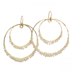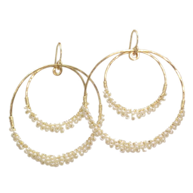 Hammered circles with ivory pearls wrapped around, about 2" long.
