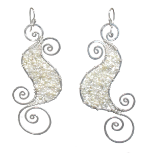 Hammered spiral shapes wrapped with pearls, about 2-3/4" long.