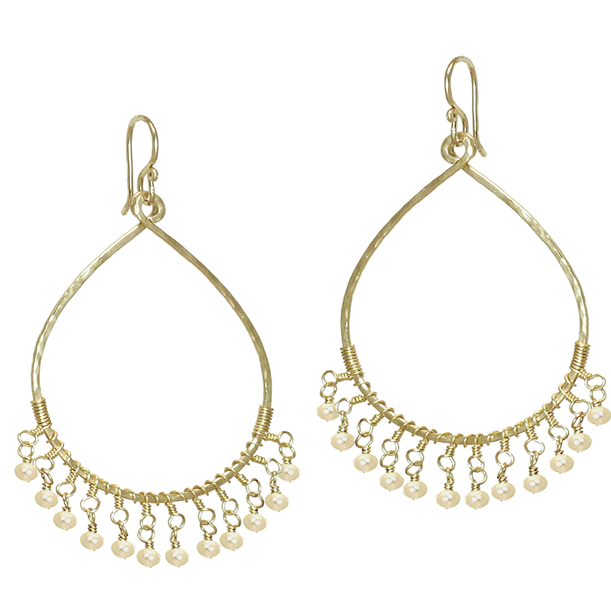 Hammered drops with dangling ivory pearlswrapped around, about 2-1/4" long.