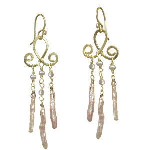 Pink biwa pearls on hammered curled wire, about 2-1/2" long.