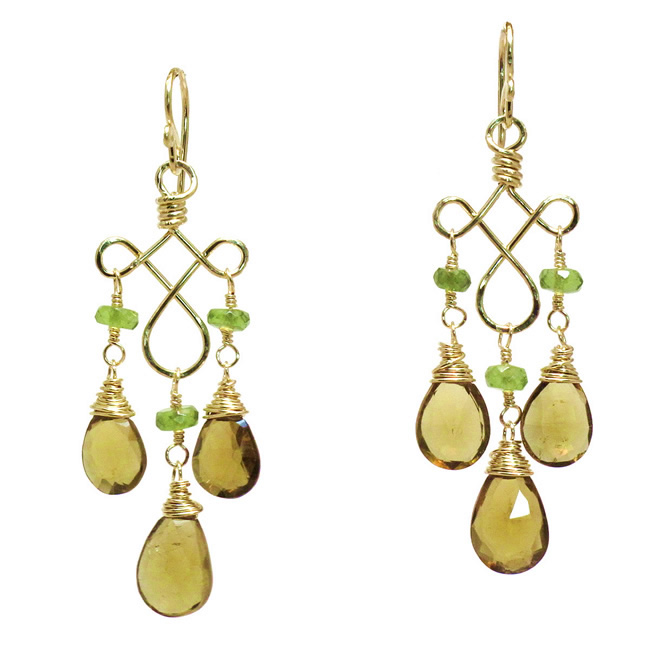 Peridot and whiskey quartz on hammered curled wire, about 2" long.