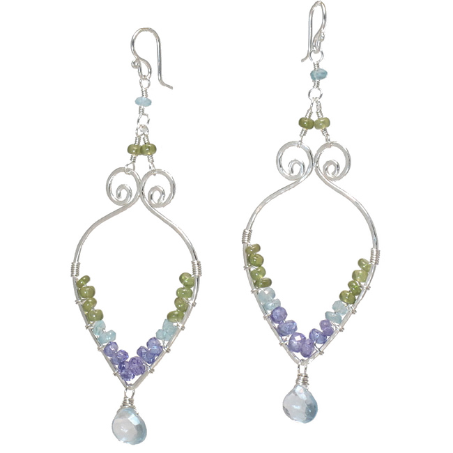 Hammered swirl drop shapes wrapped with vessonite, apatite, tanzanite, and aquamarine, about 2-1/4" long.