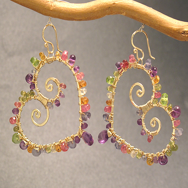 Hammered hearts with peridot, citrine, pink tourmaline, tanzanite and amethyst, about 1-3/4".