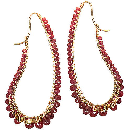 Hammered drop hoops wrapped with ruby, about 2-1/2".