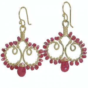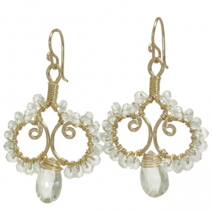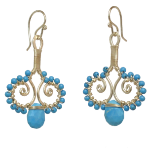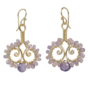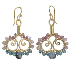 Hammered swirl drops wrapped with your choice of stone, about 1-1/2" long.