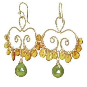 Hammered drop shapes wrapped with amber and vessonite, about 1-3/4".
