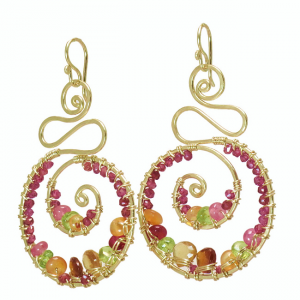 Hammered swirl shapes wrapped with ruby, citrine, mandarin garnet, peridot, about 2-1/4" long.