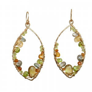 Hammered marquis shapes wrapped with whiskey quartz, moss aquamarine, vessonite, and citrine, about 2-1/4" long.