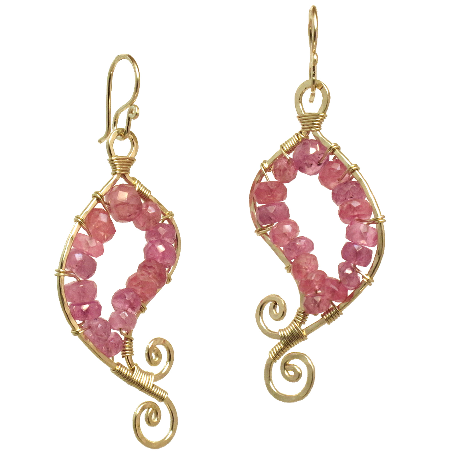 Hammered swirl drops wrapped with your choice of stone, about 2" long.