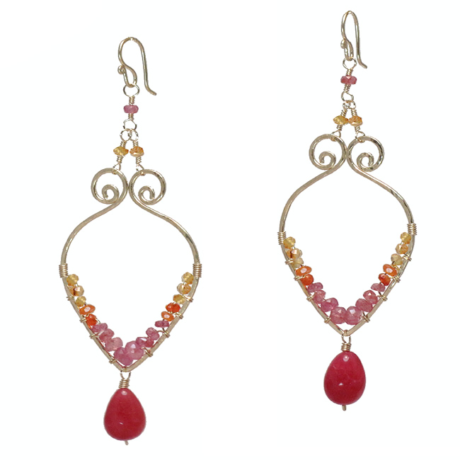 Hammered drop shapes wrapped with orange sapphire, carnelian, pink and red ruby, about 2" long.