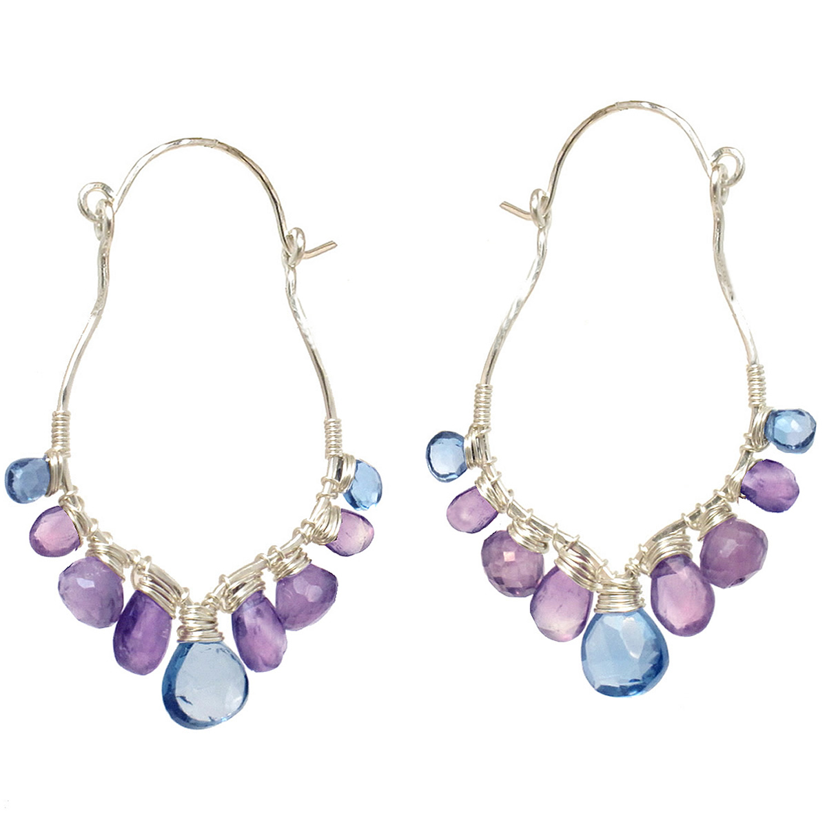 Hammered drop shapes wrapped with chalcedony, amethyst and london blue quartz, about 2-1/2" long.