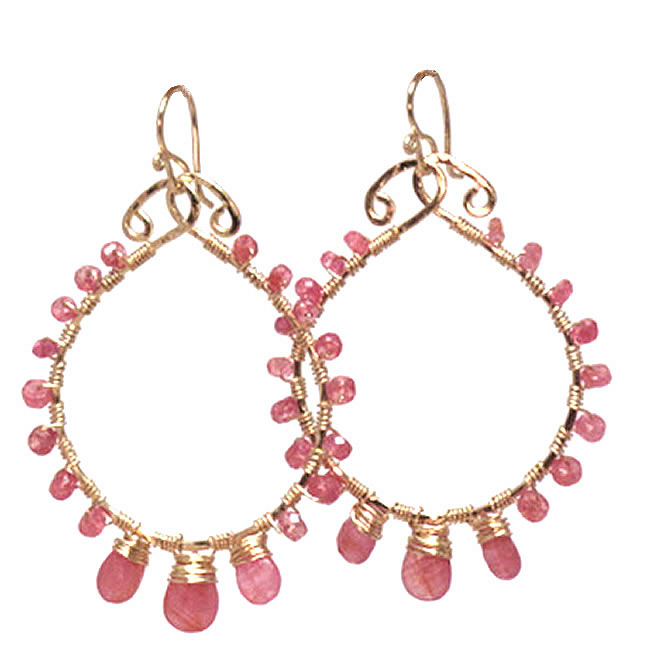 Hammered swirl drop shapes wrapped with pink ruby, about 2" long.