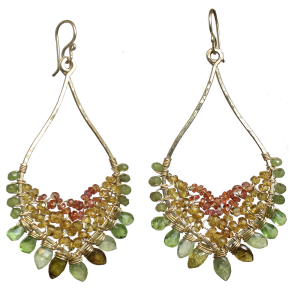 Hammered marquise shapes wrapped with pink ruby, orange sapphire, mandarin garnet, green garnet, and peridot, about 2-1/4".
