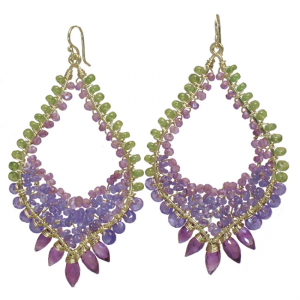Hammered drop hoops wrapped with peridot, tanzanite, and amethyst, about 2".