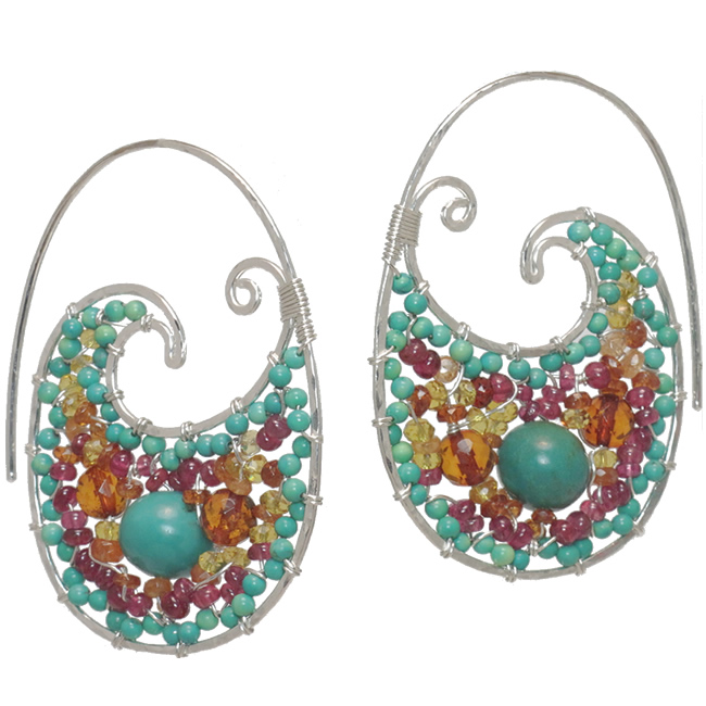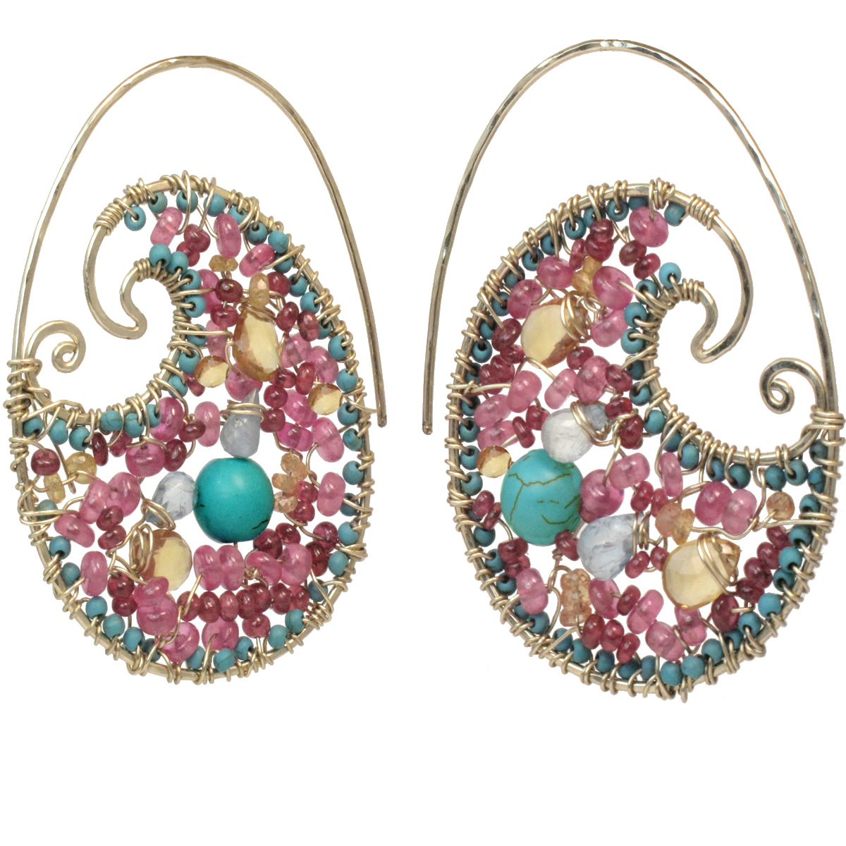Pink ruby, mandarin garnet, aquamarine, and turquoise wrapped inside of swirled hoops, about 2".