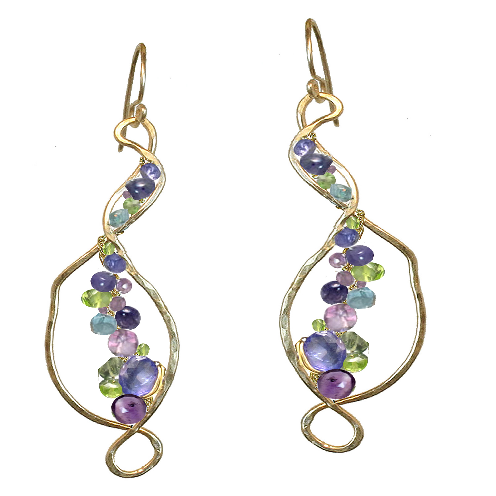 Hammered drops wrapped with peridot, amethyst, and london blue quartz, about 2-1/4" long.