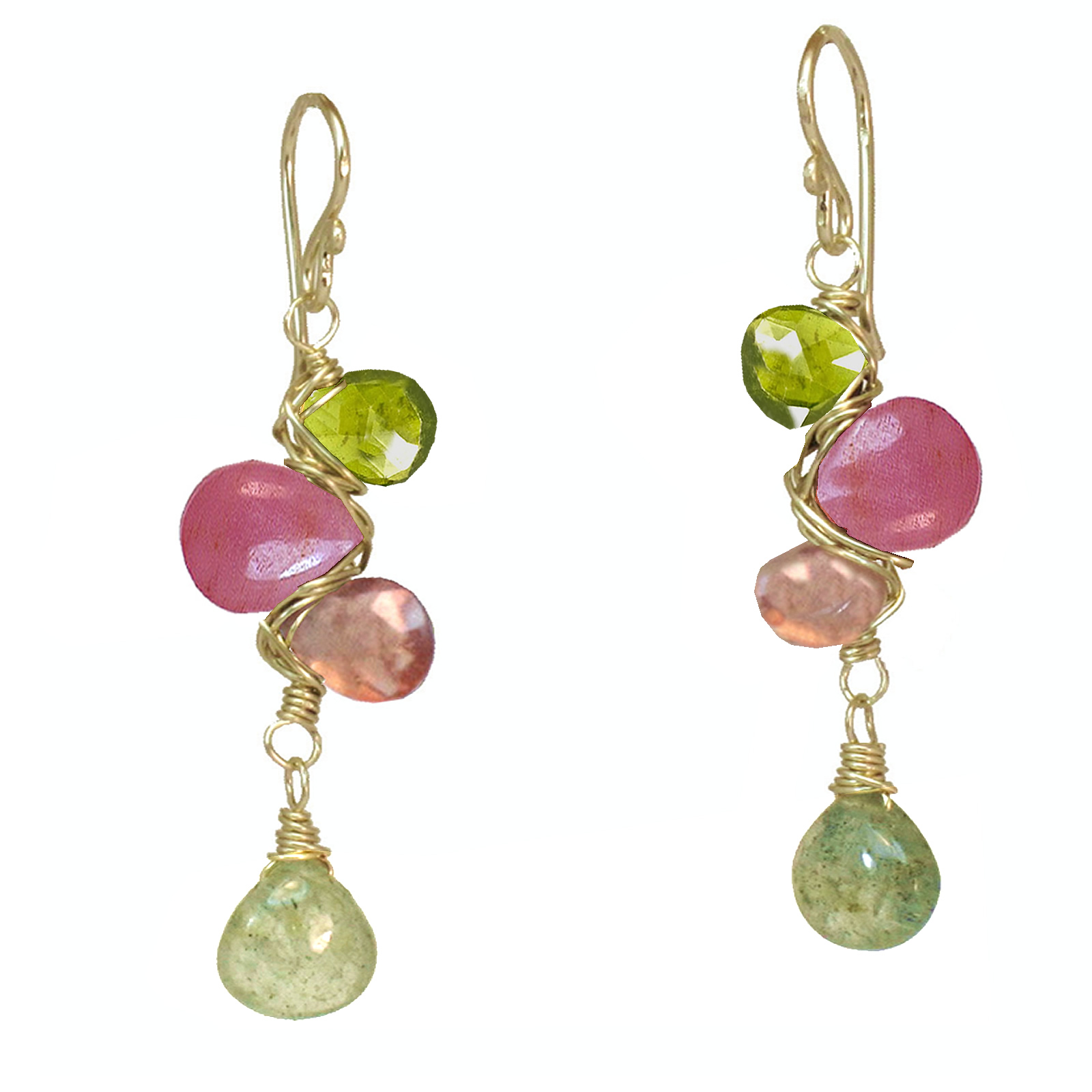 Woven tourmaline, peridot, and rhodocrosite with moss aquamarine, about 1-1/4".