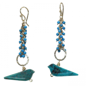 Turquoise rondelles and turquoise birds on hammered rings, about 2-3/4" long.
