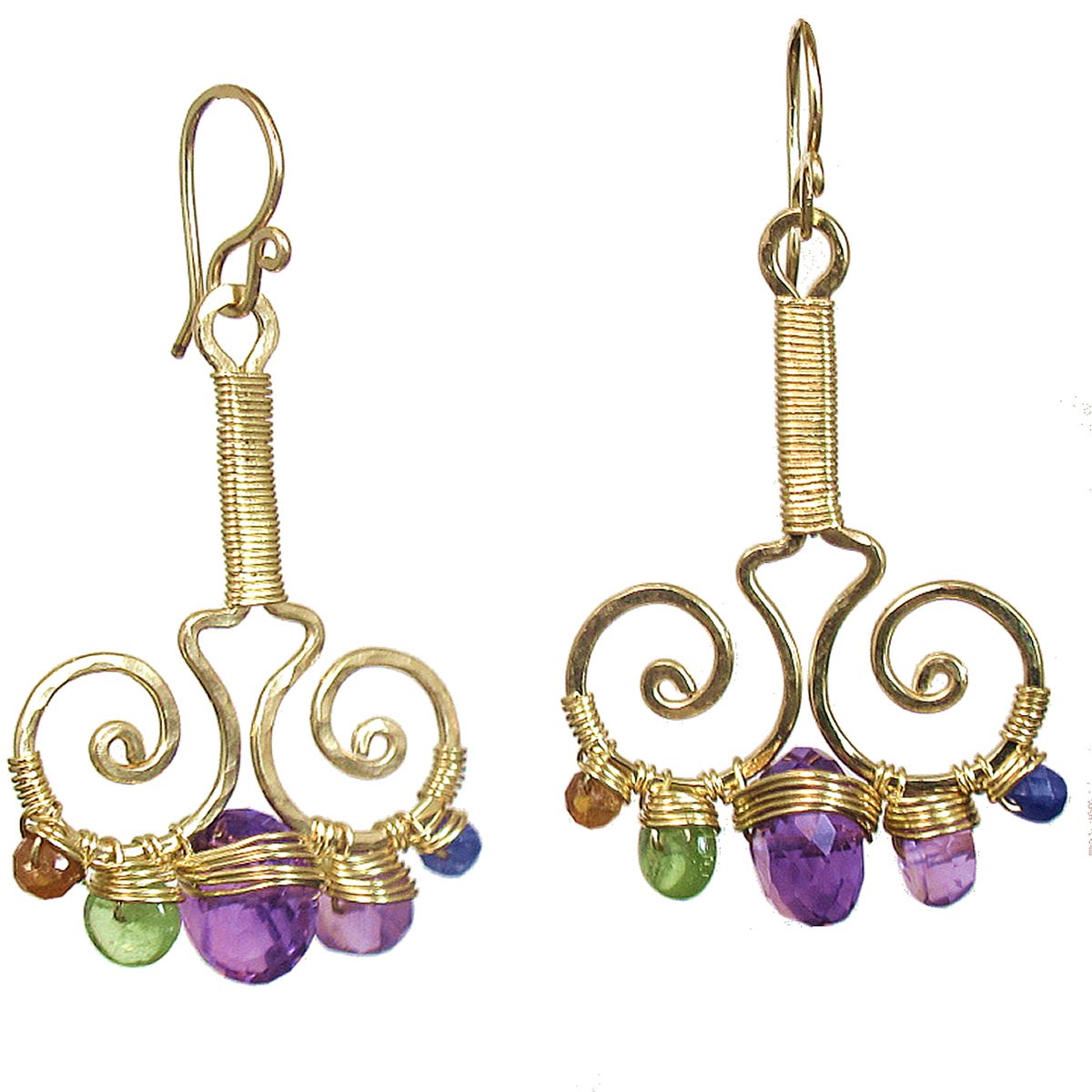 Hammered wired swirl drops with mandarin garnet, peridot, tanzanite, and amethyst, about 1-3/4" long.