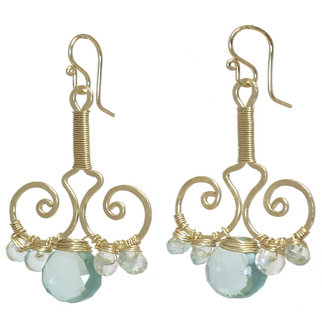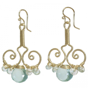 Hammered wired swirl drops with aquamarine, about 2" long.