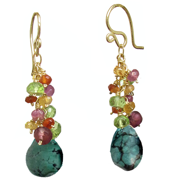 Clusters of peridot, carnelian, ruby, and turquoise, about 2" long.