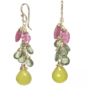 Clusters of pink sapphire, vessonite, and lemon chalcedony, about 2" long,