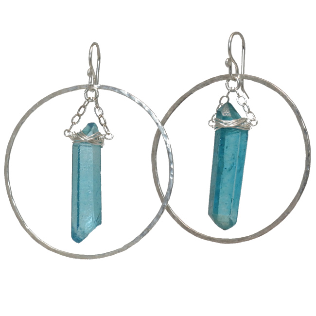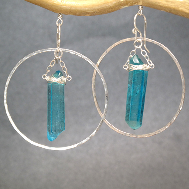 Hammered hoops with teal blue quartz dagger, about 1-3/4" long.