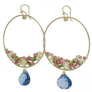 Hammered hoops wrapped with pink tourmaline, prehnite, peridot, and london blue quartz, about 2" long.