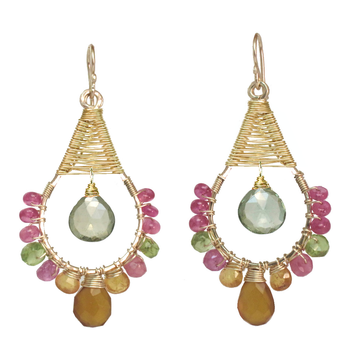 Hammered drop hoops wrapped with pink ruby, mandarin garnet, peridot, and green amethyst, about 2" long.