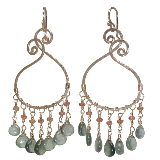 Hammered drop hoops with orange sapphire and moss aquamarine, about 2".