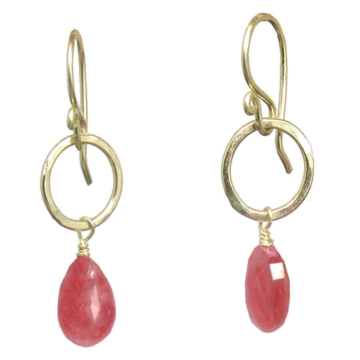 Pink tourmaline on hammered circles, about 1-1/4".