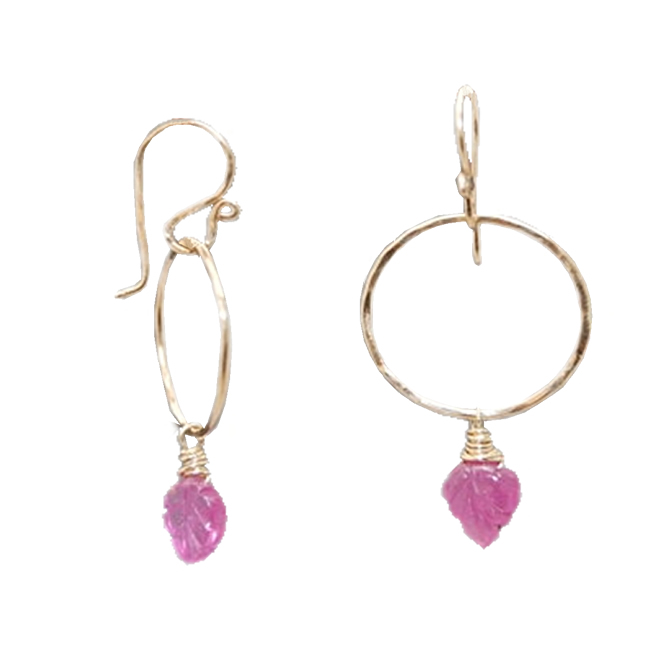 Pink sapphire leaf on hammered circle, about 1-1/4" long.